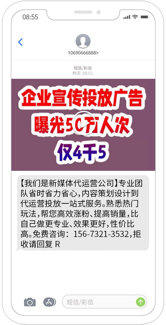 視頻短信發送能夠覆蓋移動、聯通、電信用戶,正規集團視頻短信通道,快速、可靠、穩定、形象好,能快速將您的訊息投放到用戶的手機。
